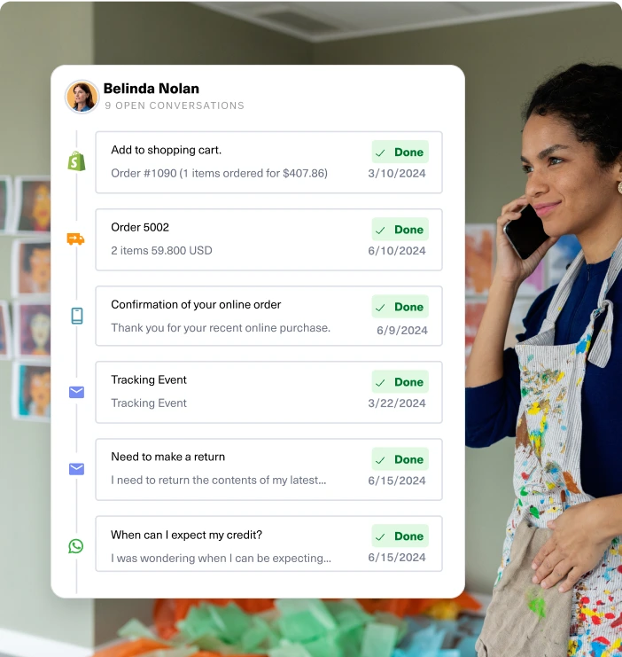 The timeline is where agents spend most of their time interacting with customers. This is where you'll see a chronological list of all customer interactions with your company, like email and chat conversations, order history, appointments, and purchase history.