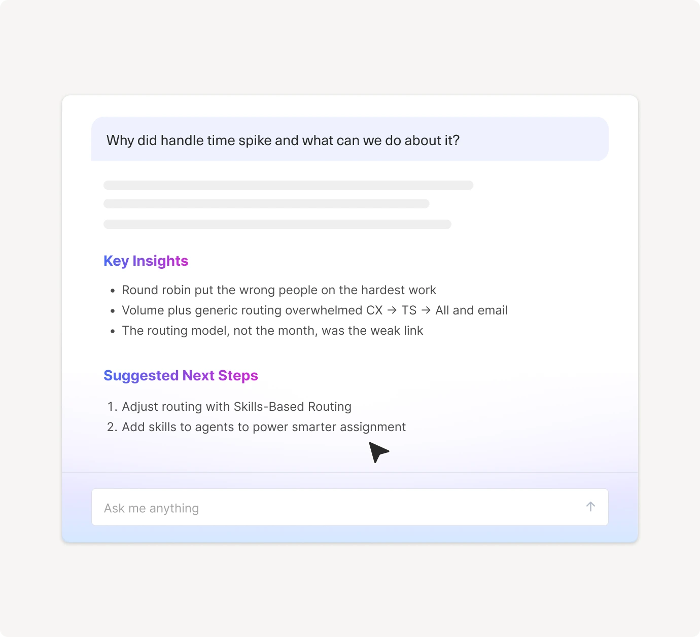 Turn every question into a clear, data-backed answer. Get real-time visuals, simple explanations, and practical recommendations that help you make faster, smarter decisions across your CX organization.