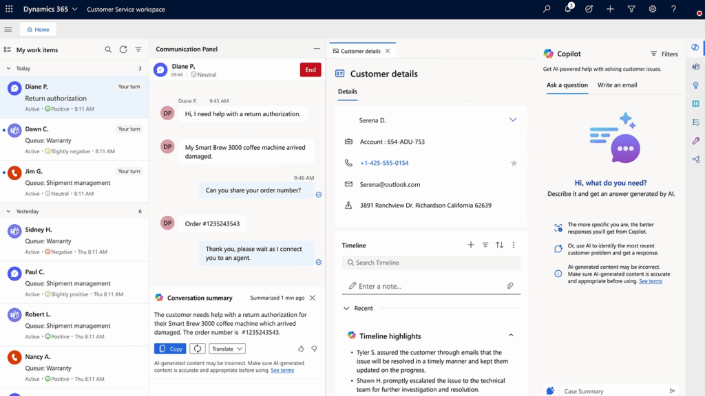 - Customer and conversation summaries: Clean, context-rich summaries at the top of the timeline so the rep can start mid-story without rereading threads.