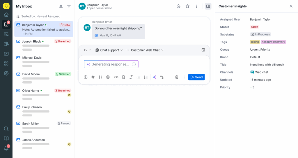 - Suggested responses (drafts): A tailored draft reply based on the customer’s situation, tone, and aligned to brand policies. Rep only has to edit and send.